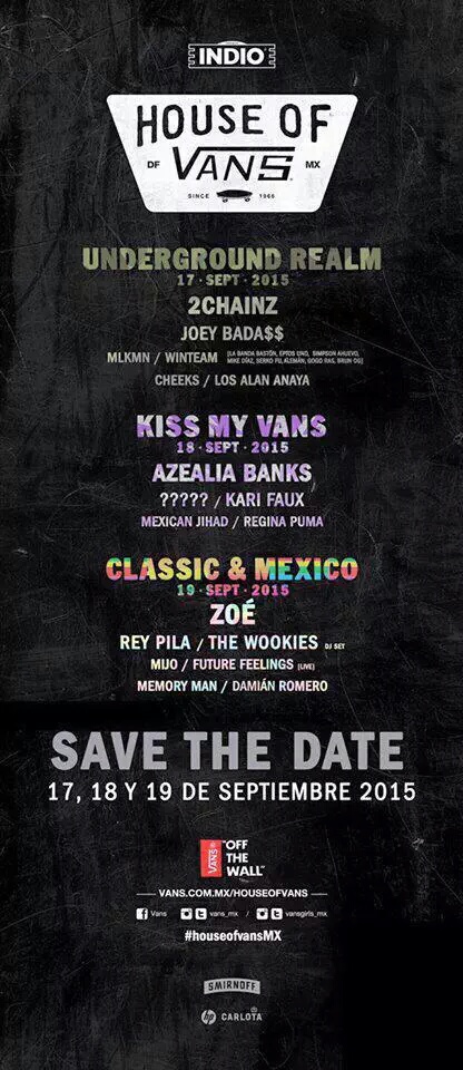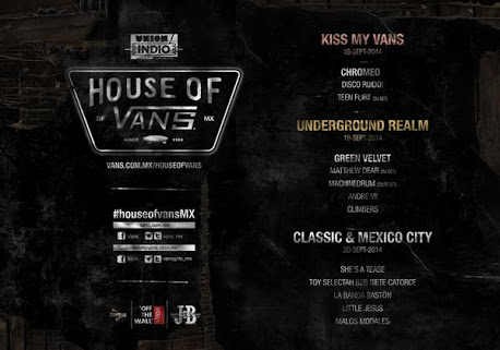 VANS la icónica marca inspirada en el sur de California, especializada en apparel y calzado para deportes de acción, trae por tercera ocasión HOUSE OF VANS a la ciudad de México, un espacio en donde convergen los cuatro pilares de la marca: los deportes de acción, el arte, la moda y la música, de manera simultánea y en una versión pop up del reconocido venue en Brooklyn, NY. Éste reunirá a talento nacional e internacional del ámbito musical, así como a los equipos globales de skate, bmx y reconocidos artistas urbanos con una curaduría por parte de Ciler, artista visual mexicano. Vans e Indio presentan la tercera edición de House of Vans los días 17,18 y 19 del mes de Septiembre.
