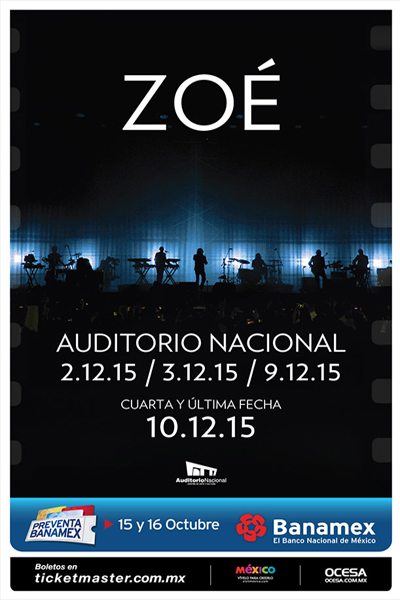A casi un año de su presentación en el Foro Sol de la Ciudad de México, Zoé, la banda más importante actualmente del rock mexicano, regresará a los escenarios de la capital para ofrecer lo mejor de su rock alternativo. Las fechas pactadas para estos memorables conciertos serán el martes 2 y miércoles 3 de diciembre y qué mejor marco que en las instalaciones del Auditorio Nacional, sitio que han pisado anteriormente con gran éxito. La preventa Banamex se realizará los días 23 y 24 de septiembre.
