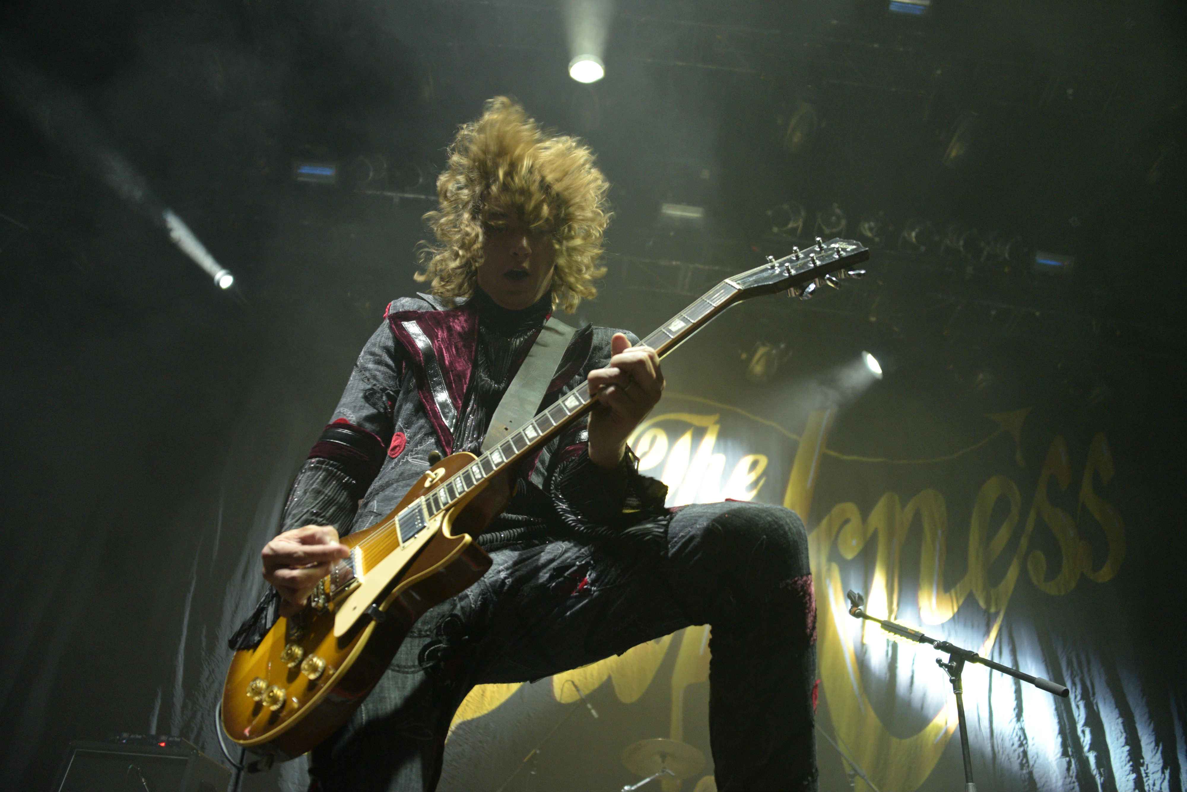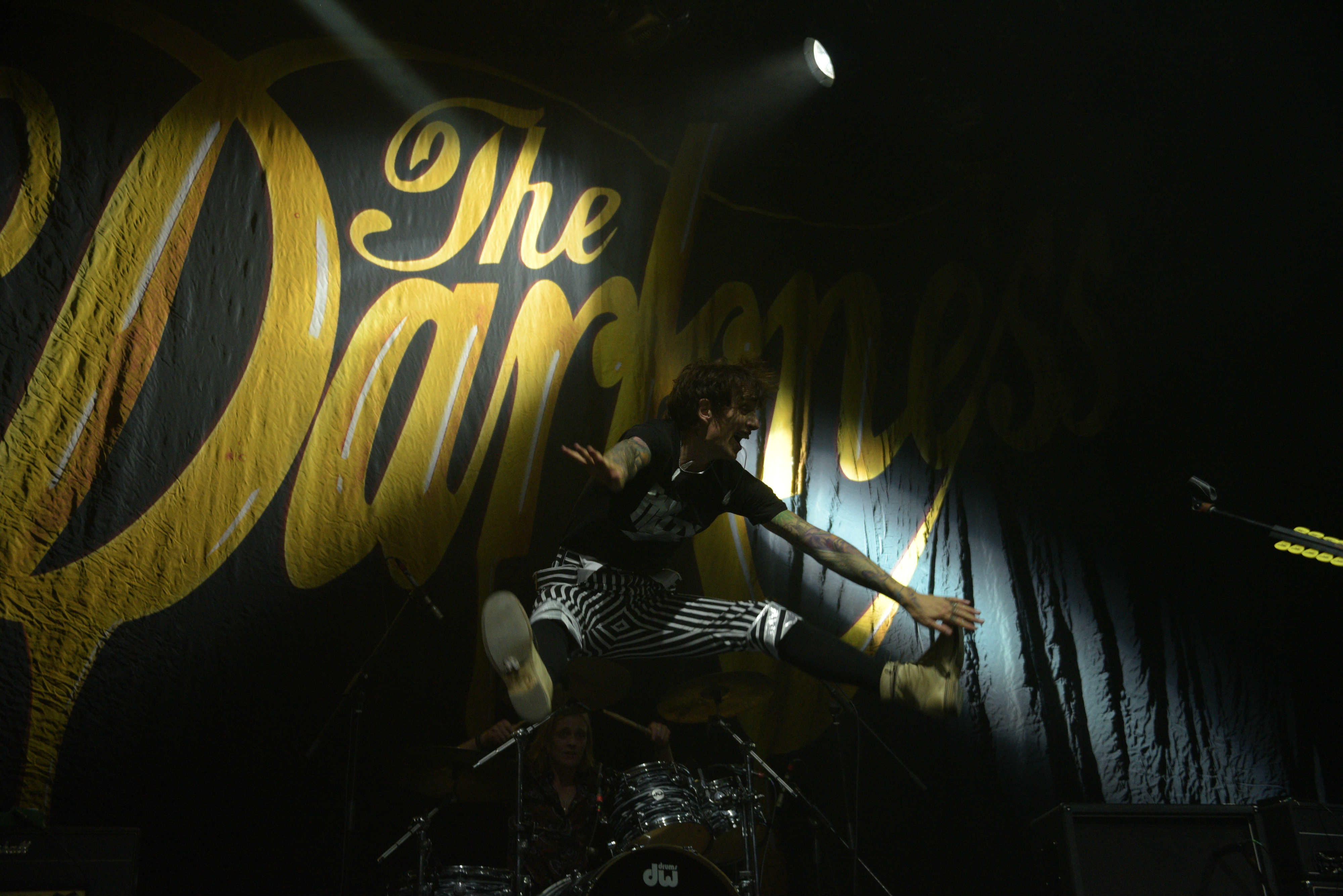 La banda representativa del Glam Rock hizo de las suyas al iniciar su show con «barbarian» y estruendosos sonidos de guitarras acompañadas de una manta gigante color negro de fondo que plasmada con letras decia THE DARKNESS, Justin Hawkins bromea con el personal del inmueble y como ya es costumbre fue despojándose de su vestuario el cual lucía con un traje a rayas blancas y negras de tirantes mientras nos mostraba las notas que alcanzaba con su voz aguda que registraba.