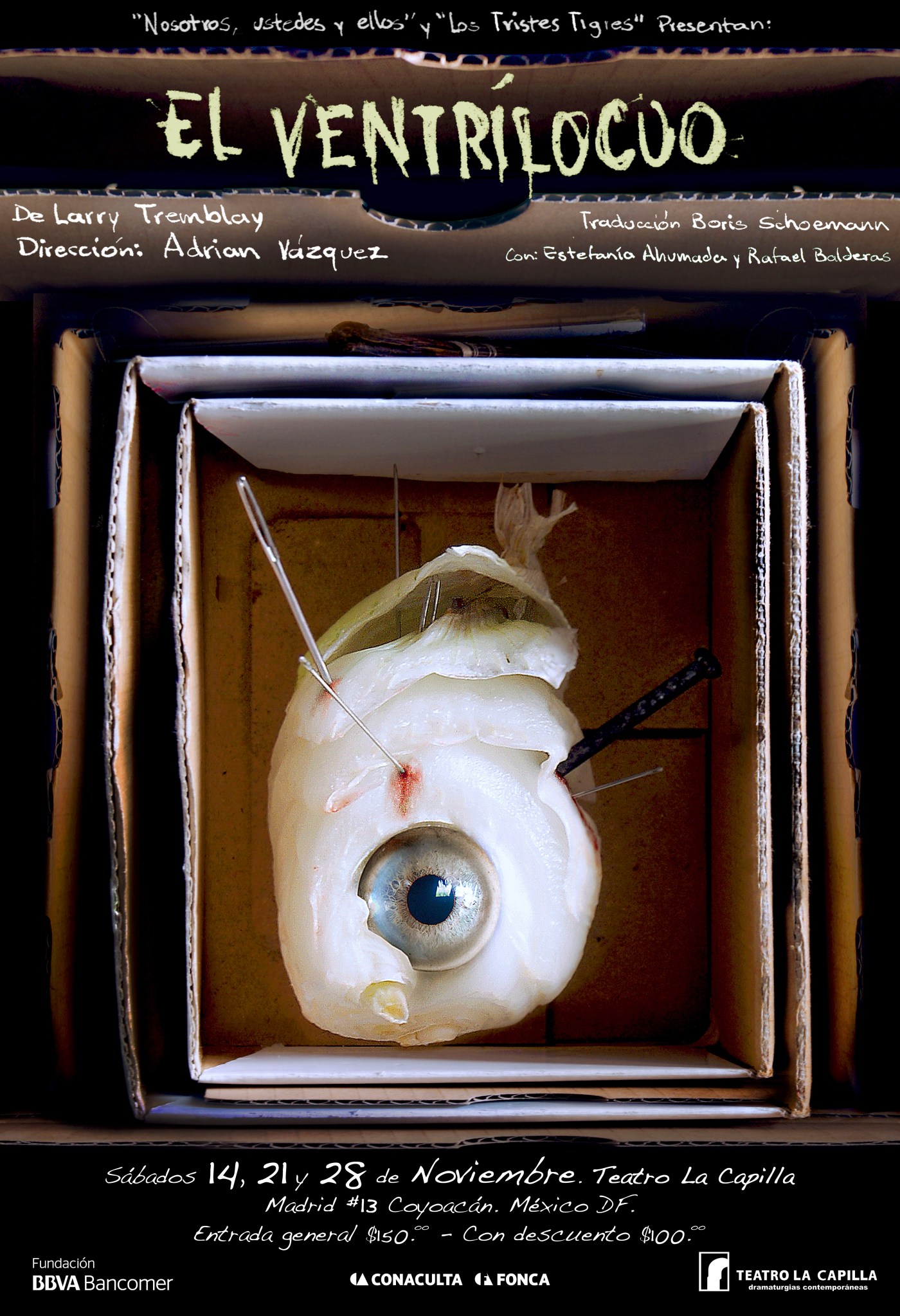 Este sábado 14, 21 y 28 de noviembre presentará la obra teatral El ventrílocuo del escritor canadiense Larry Tremblay, dirigida por Adrián Vázquez Teatro La Capilla.