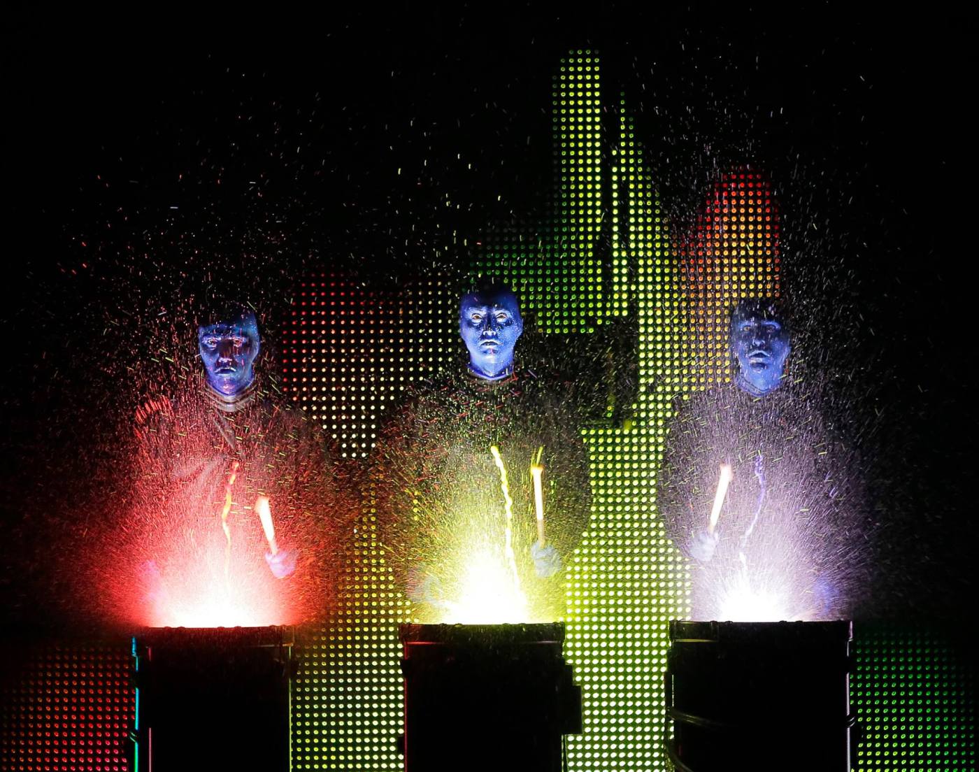 BLUE MAN GROUP Fue fundado en 1991 por Phil Stanton, Chris Wink y Matt Goldman quienes representan un trío azul de mimos pelones que incorporan la pantomima con música rock y electrónica, con un especial énfasis en las percusiones.