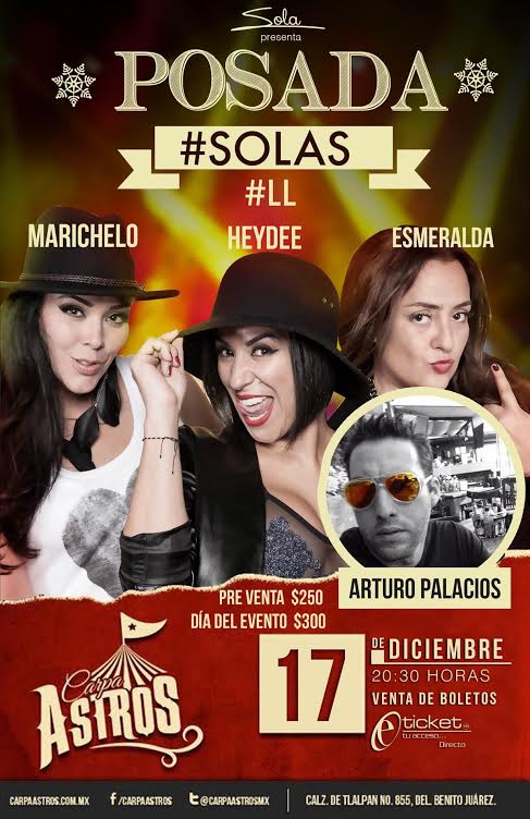 Las instalaciones de la Carpa Astros serán el marco perfecto para la celebración de la Posada #Solas, donde Marichelo, Heydee y Esmeralda, quienes son parte importante y esencial de la serie de televisión Lucky Ladies, así como Arturo Palacios, convivirán, festejarán y pasarán un rato ameno y delicioso con sus seguidores. La cita para esta fiesta llena de desenfado y mucha diversión será el jueves 17 de diciembre 20:30 horas