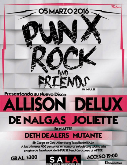 Impulse Producciones y BoomBox Entertainment se complacen en presentar la primera edición del Punx Rock and Friends, el cual se llevará a cabo el próximo 5 de marzo en las instalaciones del SALA, ubicado en la calle Puebla #186, esquinaInsurgentes.