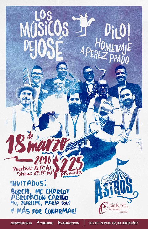 La agrupación mexicana Los Músicos de José con más de 18 años de trayectoria en la escena musical independiente preparan el lanzamiento de su 4to álbum de estudio titilado: “Dilo!” un homenaje sonoro y reinterpretación musical de la obra Del Rey del Mambo: Dámaso Pérez Prado, el próximo 18 de marzo a las 21:00 hrs. en Carpa Astros ubicado en Calzada Tlalpan.No. 855 Casi Esquina Calle Giros Postales 03410 donde además de música, baile y fiesta revivirán aquella época en la que Pérez Prado se presentaba en los legendarios salones de baile.