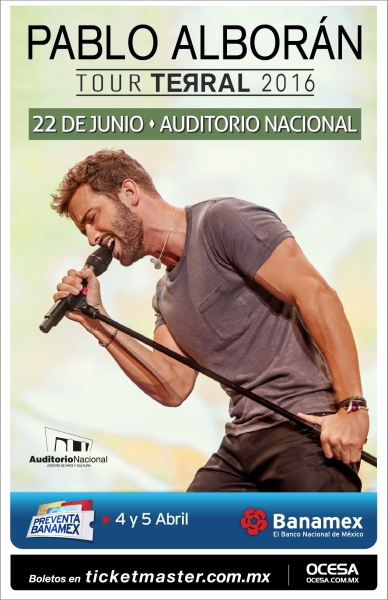 Tras el éxito obtenido en su presentación del año pasado en el Auditorio Nacional, el compositor español Pablo Alborán, regresa nuevamente al Coloso de Reforma con su Tour Terral 2016, donde demostrará una vez más por qué es uno de los máximos ídolos del siglo XXI. La fecha para deleitar a las fanáticas mexicanas será el próximo miércoles 22 de junio en el Auditorio Nacional. La Preventa Elite se llevó a cabo el domingo 3 de abril, y la Preventa Banamex se efectuará el 4 y 5, los boletos estarán disponibles para el público en general el dia 6 de abril y en taquillas del Auditorio Nacional o sistema ticketmaster
