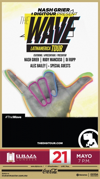La estrella de redes sociales, Nash Grier, se presentará por primera vez en la Ciudad de México como parte de su gira “The Wave Tour” por Latino América. Sus miles de seguidores podrán disfrutar de este espectáculo el próximo 21 de Mayo en El Plaza Condesa. Los boletos ya están a la venta desde el Martes 12 de Abril en taquillas y la red Ticketmaster.