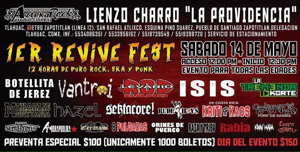 Con la plena convicción de presentar lo mejor de los géneros ska, rock urbano y punk del país, el Festival Revive Fest anuncia su primera edición dentro de las instalaciones del Lienzo Charro “La Providencia” ubicado a unos pasos del Metro Zapotitlán (Línea 12) reuniendo para esta ocasión a bandas legendarias y reconocidas de cada uno de éstos géneros. Es así que agrupaciones como Botellita de Jerez, Sekta Core, Vantroi, Rod Levario, Isis, La Tremenda Korte, Hazel, Charlie Monttana, Los Rude Boys, Kriti Kaos (de Costa Rica), Graffiti 3, Semáforos, Obra Publika, Erratas, 8 Pulgadas, Orines de Puerco, Raza y Tribu, Rabia, Krav Maga y Coapa Bitch unirán esfuerzos para conjuntar diversos estilos y hacer de ésa tarde motivo de fiesta a partir de la una de la tarde en un concierto que pretende abarcar doce horas de música.