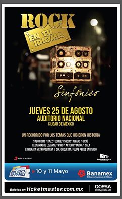 Tras su exitoso paso por la decimoséptima edición del Festival Vive Latino, el colectivo de músicos del proyecto Rock en tu Idioma Sinfónico se alistan para desempolvar los viejos clásicos del rock en español, y para tal efecto, llegarán a las instalaciones del Auditorio Nacional el próximo jueves 25 de agosto. Los boletos estarán en preventa Banamex los días 10 y 11 de mayo. Mientras que la venta al público en general comenzará a partir del 12 de mayo en las taquillas del inmueble y a través del Sistema Ticketmaster.