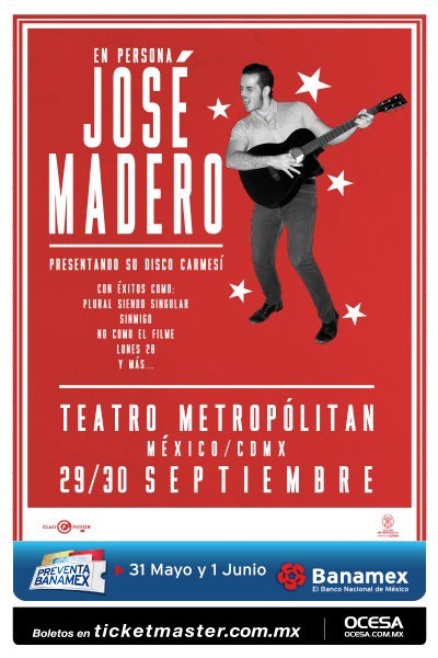 El cantante, compositor, escritor, productor y guitarrista José Madero Vizcaíno, mejor conocido como José Madero, vendrá a la CDMX para presentar a sus fieles seguidores los temas de su primer disco solista llamado Carmesi. El regio, se adueñará por dos noches, 29 y 30 de septiembre, del estrado del Teatro Metropólitan. La preventa Banamex se realizará los días 31 de mayo y 1º de junio.