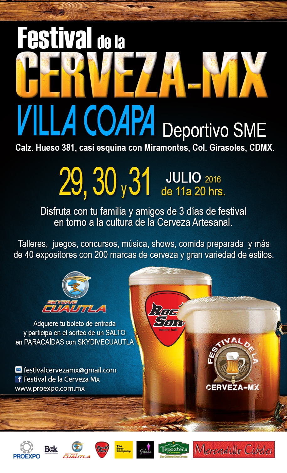 EL FESTIVAL DE LA CERVEZA MX- VILLA COAPA tendrá lugar los días 29, 30, y 31 de julio en un horario de 11 a 20 hrs., en el Deportivo SME ubicado en Calzada del Hueso 381, casi esquina con Miramontes, Colonia Girasoles, CDMX.