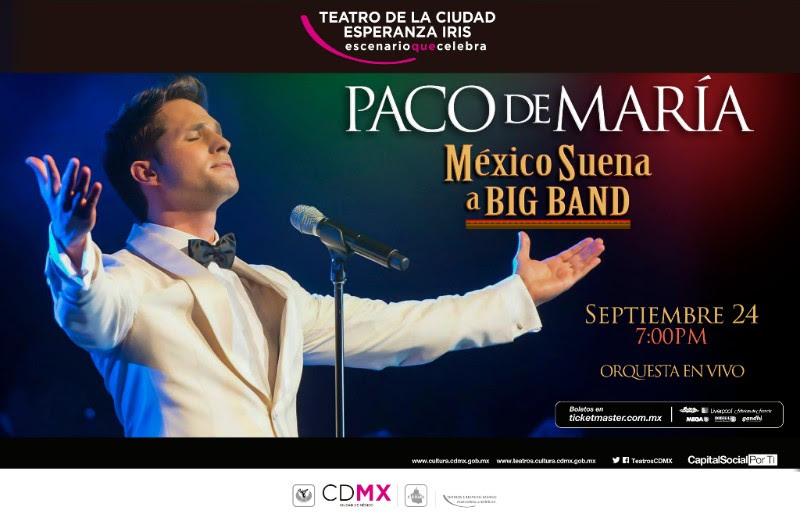 Paco de María se ha caracterizado por ser punta de lanza al rescatar el género de Big Band en México, además de lograr una mezcla exquisita entre el pasado y el presente dando siempre un toque de innovación a sus shows, prueba de esto será el espectáculo que nos tiene preparado para el próximo 24 de septiembre en lo que será su primera presentación en el Teatro de la Ciudad «Esperanza Iris», en donde además de mostrarnos sus temas ya conocidos nos sorprenderá con un repertorio de inmortales autores mexicanos de la época de oro con jazz y swing donde tendrá lugar un homenaje póstumo a Juan Gabriel quien en vida, le regalo el tema de “Enamórate”, mismo que le dio el título al primer álbum de Paco de María; posteriormente “El Divo de Juárez” lo invitaría a participar en uno de sus shows en el Auditorio Nacional. (Cabe destacar que el sonorense participó el pasado 3 de septiembre en el Homenaje realizado en Ciudad Juárez Chihuahua con las cenizas presentes de Juan Gabriel cantando dos temas con el Mariachi que acompañaba al Divo a todas sus presentaciones.) Al más puro estilo de las grandes bandas y un toque de mariachi Paco de María celebrará a México y su mes patrio donde por fin podremos darnos cuenta que «México Suena a Big Band».