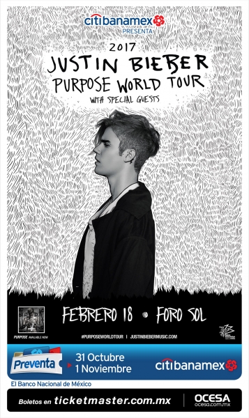 Tras emocionar a sus fans en Estados Unidos y Europa con boletos agotados para su dinámico show en vivo, la superestrella global Justin Bieber vendrá a México el próximo 18 de febrero para presentarse en el Foro Sol como parte de su gira PURPOSE WORLD TOUR en su paso por América Latina. Los miembros del BKSTG fan club podrán comprar boletos de forma anticipada los días 27 y 28 de octubre. La preventa Citibanamex será los días 31 de octubre y 1 de noviembre y la Venta General comenzará el 2 de noviembre a las 11:00 ama través del Sistema Ticketmaster en http://www.ticketmaster.com.mx.