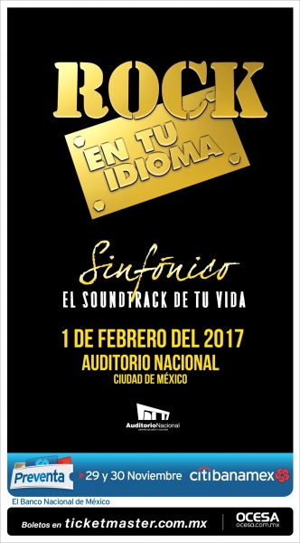 Para beneplácito de los miles de seguidores al movimiento del rock en tu idioma, el ensamble y colectivo sonoro del Rock en tu Idioma Sinfónico, encabezado y liderado por el músico Sabo Romo, regresa, una vez más, a las instalaciones del Auditorio Nacional. Es así que la noche del miércoles 1º de febrero 2017, las mejores glorias del rock en español volverán a tomar vida y forma en las voces de los grandes exponentes de aquella época y generación. La Preventa Citibanamex se realizará los días 29 y 30 de noviembre. Mientras que la venta al público en general comenzará a partir del 1º de diciembre en las taquillas del inmueble y a través del Sistema Ticketmaster.