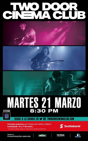 A unos meses de haber estrenado su más reciente álbum de estudio “Gameshow” el trío irlandés Two Door Cinema Club anuncia hoy que regresará a México para ofrecer un concierto el próximo21 de marzo de 2017 en el Pepsi Center WTC de la Ciudad de México. Los boletos para este show estarán disponibles en la preventa exclusiva para tarjetahabientes Scotiabank los días 16 y 17 de enero mientras que la venta al público en general comenzará el 18 de enero a las 11:00 horas a través del Sistema Ticketmaster en http://www.ticketmaster.com.mx por teléfono al 53-25-9000 y en la taquilla del inmueble.