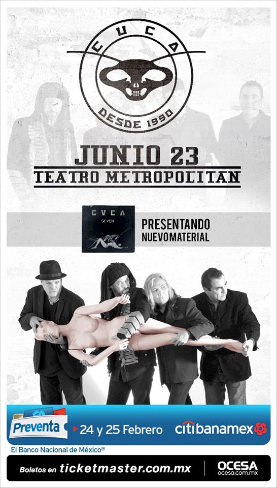 A más de 25 años de vida, Cuca se mantiene tan vigente como en sus inicios. El cuarteto oriundo de la Perla de Occidente, donde a partir del 2014 arroparon en sus filas al experimentado guitarrista de la CDMX Alex Otaola (La Barranca, San Pascualito Rey, Astrolab-IO) retornará a los escenarios de la Capital para presentar a su fiel legión de “cucarachos” su nuevo trabajo discográfico, Seven, así como una metralla de éxitos que los han colocado como una de las bandas más importantes del rock nacional. La cita para esta velada llena de rock and roll será el viernes 23 de junio en el Teatro Metropólitan. La preventa citibanamex se realizará los días 24 y 25 de febrero. Mientras que la venta al público en general comenzará a partir del 26 de febrero en las taquillas del inmueble y a través del Sistema Ticketmaster.