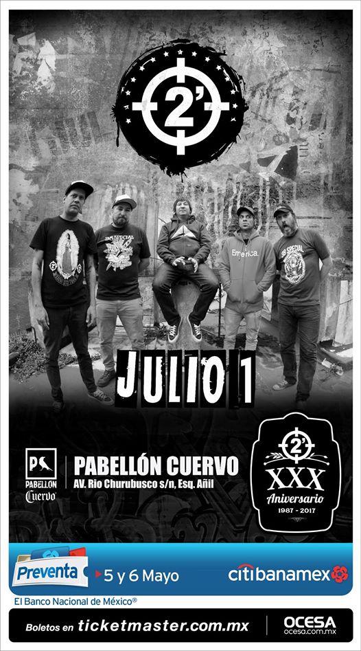 2 Minutos, una de las principales bandas del punk rock del Cono Sur, llegará a la Ciudad de México para festejar con su fiel legión de seguidores tres décadas de exitosa trayectoria. La fecha pactada para tremendo y explosivo festín sonoro será el sábado 1º de julio en el Pabellón Cuervo. La preventa citibanamex se realizará los días 5 y 6 de mayo. La venta al público en general comenzará a partir del 7 de mayo en las taquillas del inmueble y a través del Sistema Ticketmaster.