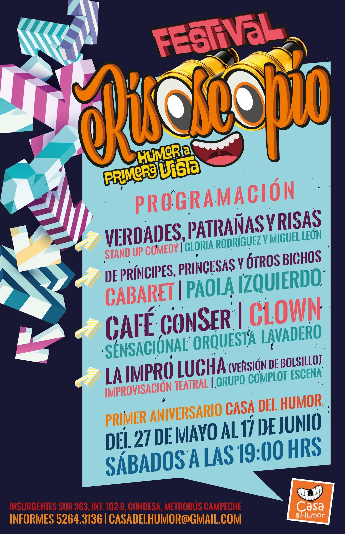 Dentro del marco de la celebración del primer aniversario de Casa del Humor, se ha organizado el Festival Risoscopio, con espectáculos de cada una de las disciplinas que se imparten dentro del recinto, protagonizados por los profesores de cada área: Gloria Rodríguez (stand up), Paola Izquierdo (teatro cabaret), Jesús Díaz (clown) y José Luis Saldaña (improvisación teatral), dando como resultado una gala de primerísima calidad.
