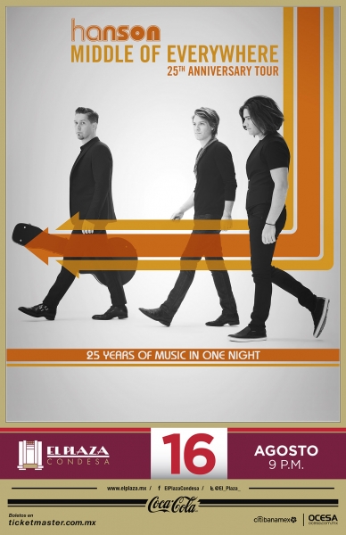 Hanson, el trío pop-rock más exitoso de los 90´s, celebrarán 25 años de carrera con la gira mundial “Middle Of Everywhere 25th Anniversary World Tour”, la cual llegará a la Ciudad de México el próximo 16 de Agosto en El Plaza Condesa. Los boletos estarán a la venta a partir del Jueves 1ro de Junio en taquillas de El Plaza y la red Ticketmaster en http://www.ticketmaster.com.mx y al teléfono 53-25-9000.