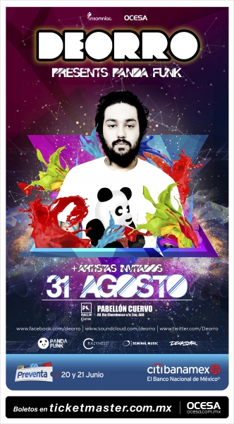 El DJ y productor Angelino de origen mexicano Deorro anuncia hoy que presentará un show a lado de sus amigos y compañeros del sello PANDA FUNK el próximo 31 de agosto de 2017 en las instalaciones del Pabellón Cuervo de la Ciudad de México. Los boletos para este imperdible showcase estarán disponibles en Preventa Citibanamex los días 20 y 21 de junio y en Venta General a partir del 22 de junio a través del Sistema Ticketmaster en http://www.ticketmaster.com.mx y al 53-25-9000 así como en las taquillas del inmueble.
