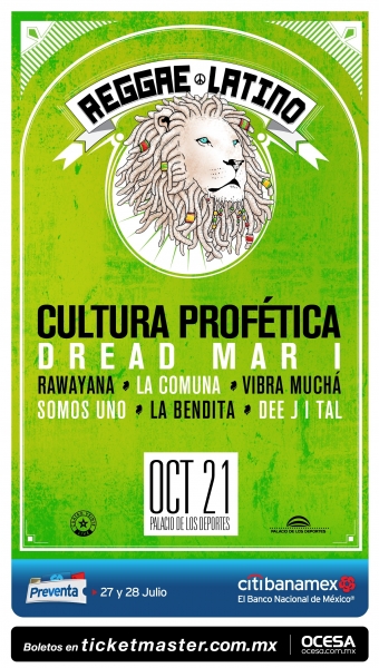 La Ciudad de México será testigo del poder sonoro del reggae de grandes proyectos musicales como Cultura Profética, Dread Mar-I, Rawayana,La Comuna, entre otros. Ellos serán parte del Festival de Reggae Latino, que se realizará el próximo sábado 21 de octubre en el Palacio de los Deportes. La preventa citibanamex se realizará los días 27 y 28 de julio. Mientras que la venta al público en general comenzará a partir del 29 de julio en las taquillas del inmueble y a través del Sistema Ticketmaster.
