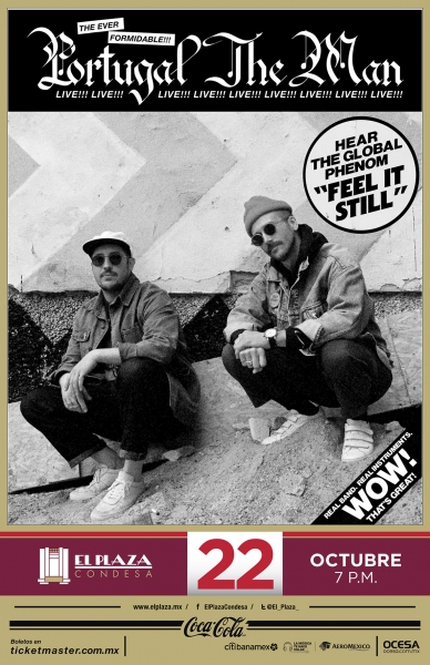 Portugal The Man regresa a la Ciudad de México para presentar en vivo los temas de su nuevo disco titulado «Woodstock», del cual se desprende el éxito mundial “Feel it still”. Esta única presentación tendrá lugar en El Plaza Condesa el próximo 22 de Octubre y los boletos estarán disponibles en venta general a partir del Viernes 28 de Julio a las 10 hrs. en la red Ticketmasteren http://www.ticketmaster.com.mx y al teléfono 53-25-9000 y a partir de las 12 hrs en taquillas del inmueble.