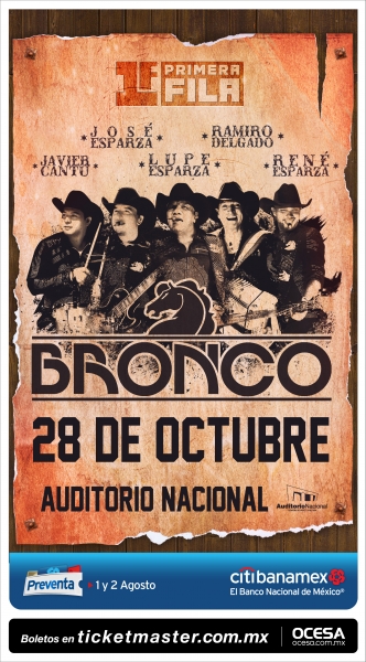 Bronco está de regreso, y luego de una extensa gira promocional, llegan al Auditorio Nacional para ofrecer un concierto el próximo 28 de octubre. La agrupación que este año celebra 37 años de trayectoria, prepara ya un festín musical para todos sus fans. Los boletos estarán a la venta en la Preventa Citibanamex, 01 y 02 de agosto. Y un día más tarde los boletos estarán disponibles para todo el público en las taquillas del inmueble Mix Up, Liverpool, al teléfono 5325 9000 y en el sitio web http://www.ticketmaster.com.mx.