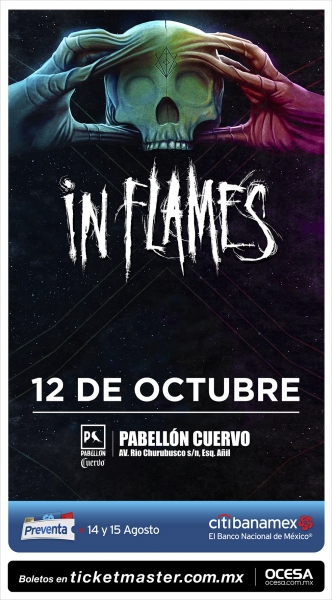 Hoy, los visionarios del metal sueco IN FLAMES anuncian que ofrecerán un concierto en el Pabellón Cuervo de la Ciudad de México el 12 de octubre de 2017 como parte de su gira en apoyo a su más reciente álbum Battles. Los boletos para este show estarán disponibles en Preventa Exclusiva para tarjetahabientes Citibanamexlos días 14 y 15 de agosto y en Venta General a partir del 16 de agosto a través del Sistema Ticketmaster en http://www.ticketmaster.com.mx y por teléfono al 53-25-9000, así como en la taquilla del recinto.