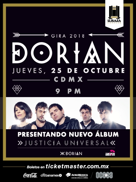 La banda originaria de Barcelona, Dorian, estará de regreso en la Ciudad de México como parte de una extensa gira por nuestro país que servirá para promocionar su más reciente disco titulado “Justicia universal”. Este reencuentro con sus fans tendrá lugar en El Plaza Condesa el próximo 25 de Octubre y los boletos estarán disponibles en venta general a partir del Martes 20 de Marzo a las 12 hrs. en taquillas del inmueble y la red Ticketmaster en http://www.ticketmaster.com.mx y al teléfono 53-25-9000.
