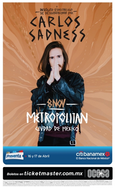 Para beneplácito de sus fieles seguidores, el carismático cantautor catalánCarlos Sadness llegará a la Ciudad de México para llevar su insólito espectáculo de desilusionismo al escenario del Teatro Metropólitan el próximo jueves 8 de noviembre presentando su nuevo trabajo discográfico llamado Diferentes Tipos de Luz. La preventa citibanamex se realizará los días 16 y 17 de abril. Mientras que la venta al público en general comenzará a partir del 18 de abril en las taquillas del inmueble y a través del Sistema Ticketmaster.