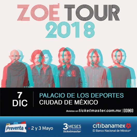 Tras colgar el letrero de localidades agotadas de sus tres conciertos del Auditorio Nacional, 8, 9 y 10 de junio, Zoé, en conjunto con OCESA, anuncia un nuevo concierto del quinteto. Ahora será en el Palacio de los Deportes. La fecha pactada para este explosivo y eléctrico recital será el viernes 7 de diciembre. La preventa Citibanamex se realizará los días 2 y 3 de mayo. Mientras que la venta al público en general comenzará el 4 de mayo en las taquillas del inmueble y a través del Sistema Ticketmaster.