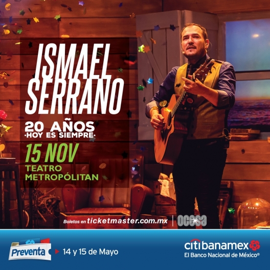 Ismael Serrano, considerado uno de los emblemas de la nueva generación de cantautores españoles, regresará a los escenarios de la capital mexicana para festejar, al lado de sus fans, cuatro lustros de exitosa carrera con su show: “20 Años. Hoy Es Música”, un espectáculo lleno de música, poesía, teatro y cine. La fecha pactada para esta exquisita bohemia será el jueves 15 de noviembreen el Teatro Metropólitan. La preventa Citibanamex se realizará el 14 y 15 de mayo. La venta al público en general comenzará a partir del 16 de mayo en las taquillas del inmueble y a través del Sistema Ticketmaster.