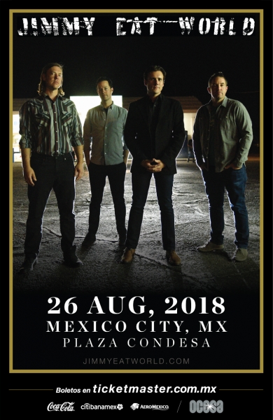 Jimmy Eat World es una de las bandas de rock alternativo más queridas en todo el mundo y este año está de regreso con nueva música. Para celebrarlo han anunciado una extensa gira por Norteamérica que llegará a la Ciudad de México este 26 de agosto en El Plaza Condesa. Los boletos estarán disponibles en venta general a partir del lunes 4 de junio a las 12 horas en taquillas del inmueble y la red Ticketmaster en http://www.ticketmaster.com.mx y al teléfono 53-25-9000.