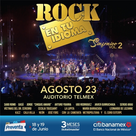 Los clásicos del rock en español que han marcado a toda una generación retornará a los escenarios de Guadalajara. El ensamble Rock en tu Idioma Sinfónico Vol. 2 vuelve a la acción. La fecha pactada para esta fiesta será el próximo jueves 23 de agosto en el Auditorio Telmex. La preventa Citibanamex se realizará los días 18 y 19 de junio. Mientras que la venta al público en general comenzará el 20 de junio en las taquillas del inmueble y a través del Sistema Ticketmaster.