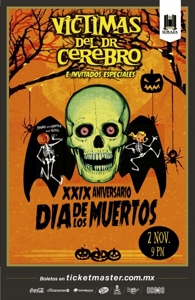 Como ya es tradición, las Víctimas del Dr. Cerebro celebrarán el día de muertos poniendo a mover el esqueleto a chicos y grandes con un concierto muy especial en la Ciudad de México el próximo 2 de noviembre en El Plaza Condesa. Este concierto también servirá para celebrar sus primeros 29 años de carrera, motivo por el cual contarán con invitados especiales para hacer de esta presentación uno de los sucesos más importantes del año. Los boletos para ser parte de este suceso ya están disponibles en taquillas del inmueble y la red Ticketmaster en http://www.ticketmaster.com.mx y al teléfono 53-25-9000.
