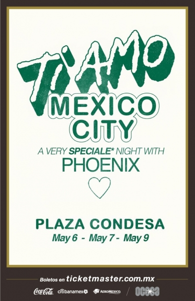 La banda francesa de mayor prestigio en la actualidad, Phoenix, volverá a nuestro país de la mano de su disco Ti Amo, sexto en su trayectoria, y con el cual realizarán una residencia en la Ciudad de México. Las fechas pactadas para estos conciertos llenos de buena música y baile serán el 6, 7 y 9 de mayo y que mejor lugar para atestiguarlo que el escenario de El Plaza Condesa. La venta general, para las tres fechas, comenzará el viernes 23 de noviembre en punto de las 12:00 horas.