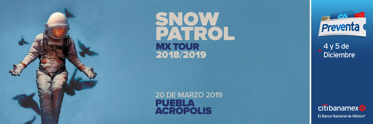Durante una carrera de dos décadas, Snow Patrol se ha forjado un lugar único en la escena internacional gracias a su música y su trabajo. Ahora, como uno de los actos en vivo más esperados en México, la banda anuncia un concierto en Acrópolis de Puebla programado para el 20 de marzo de 2019. Los boletos estarán disponibles en una preventa para fans el 29 y 30 de noviembre; después habrá una preventa para tarjetahabientes Citibanamex el 4 y 5 de noviembre; y la venta general será a partir del 6 de diciembre a través de E-Ticket en www.eticket.mx.