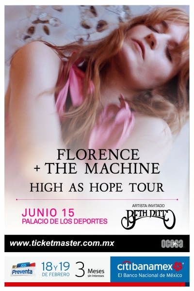 Florence + the Machine anuncia hoy que el ‘High As Hope Tour’ llegará a México con tres conciertos: primero, actuará el 15 de junio en el Palacio de los Deportes de la Ciudad de México, luego viajará a Guadalajara para actuar al día siguiente en Auditorio Telmex y por último, pero no menos importante, el 18 de junio en el Auditorio Citibanamex de Monterrey. La preventa tarjetahabientes Citibanamex será el 18 y 19 de febrero, y la venta general comenzará el 20 de febrero a través de Ticketmaster en http://www.ticketmaster.com.mx