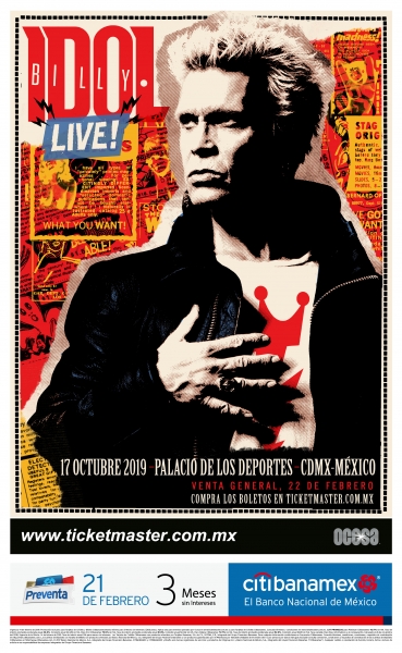 Billy Idol, una de las figuras más importantes en la historia de la música viene por primera vez en México. El músico considerado el eslabón perdido entre el punk, el new wave y el glam se presentará en la Ciudad de México próximo 17 de octubre de 2019 para ofrecer un concierto en el Palacio de los Deportes. Preventa Exclusiva para Fans registrados en http://www.billyidol.net el 20 de febrero, luego para tarjetahabientes Citibanamex el 21 de febrero y en Venta general a partir del 22 de febrero de 2019 a través de Ticketmaster en http://www.ticketmaster.com.mx y por teléfono al 53-25-9000.