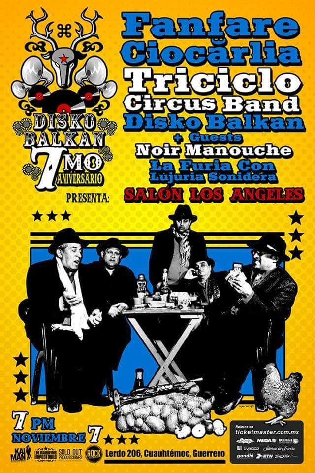 Sólo escribe el nombre de una canción que conozcas de cada uno de los siguientes grupos:  Fanfare Ciocarlia, Disko Balkan, Triciclo Circus Band, Noir Manouche, Orquesta Basura y listo ganas pase doble para este sábado 7 de noviembre en el Salón Los Angeles.