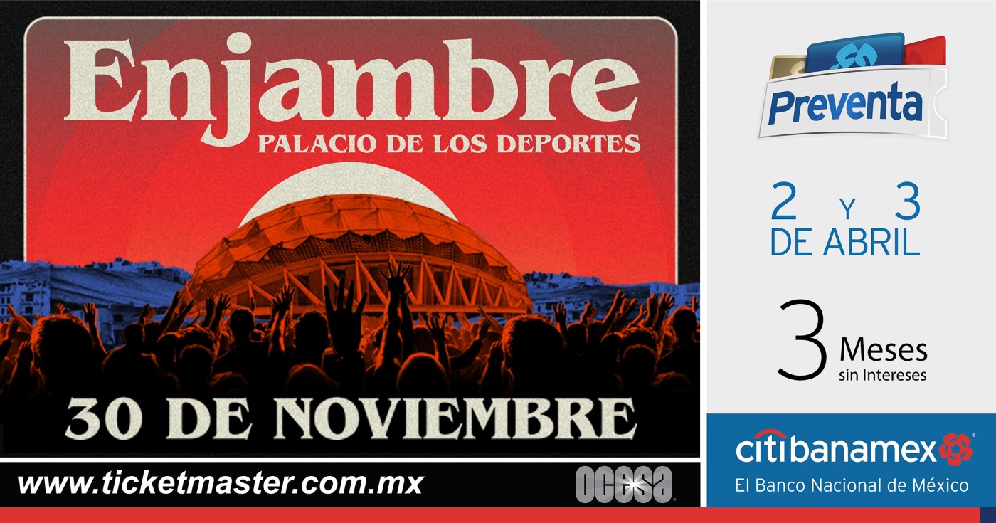 La banda oriunda de Zacatecas, Enjambre se prepara para llegar de nueva cuenta a los escenarios de la capital mexicana. Los creadores de temas como Dulce soledad y Manía cardiaca ofrecerán un energético concierto el próximo 30 de noviembre en el Palacio de los Deportes, que además servirá de marco perfecto para presentar temas del que será su nuevo disco de estudio. La preventa Citibanamex se realizará los días 2 y 3 de abril, Mientras que la venta al público en general comenzará el 4 de abril en las taquillas del inmueble y a través del Sistema Ticketmaster.
