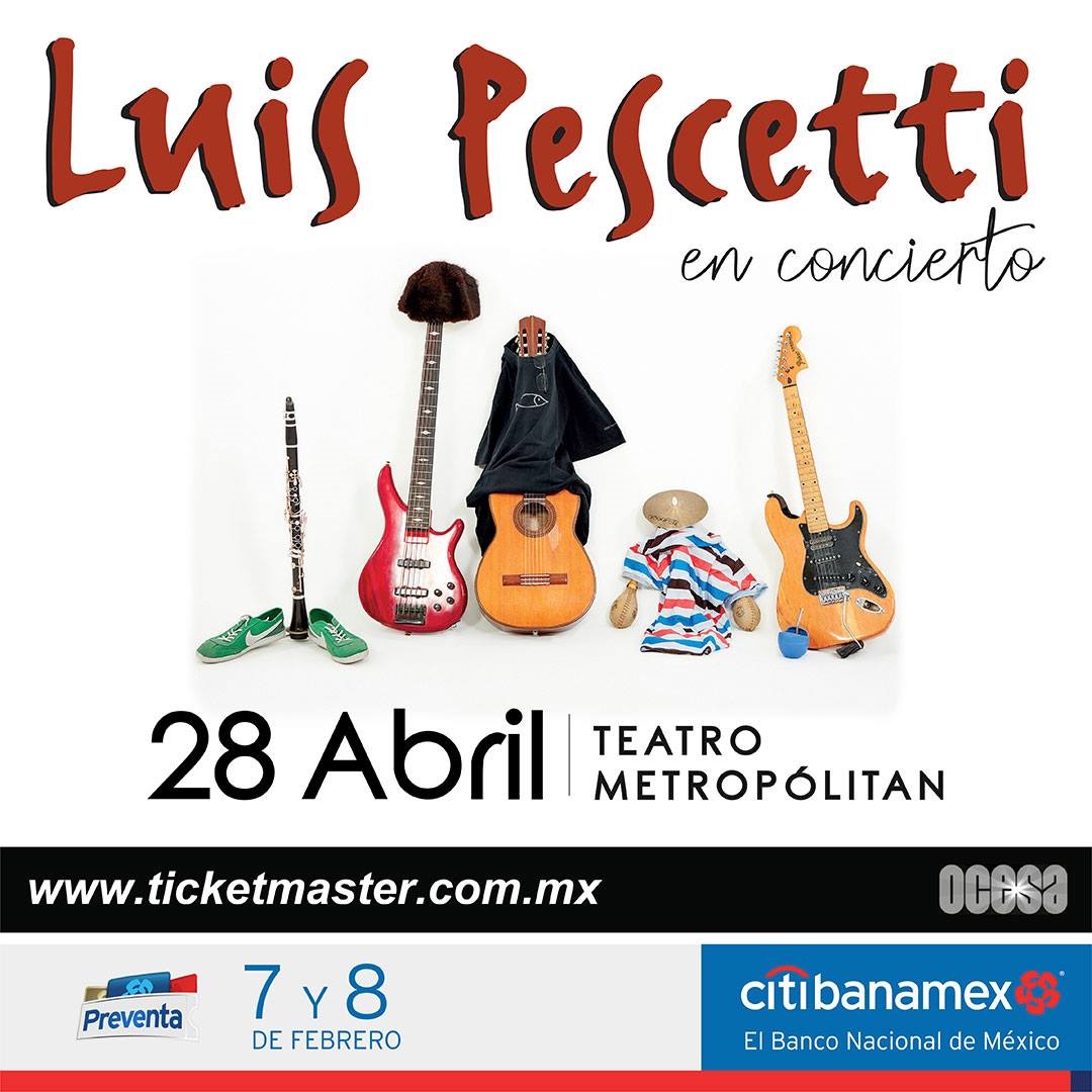 Tras casi dos años de no pisar el escenario del Teatro Metropólitan, el cantautor Luis Pescetti volverá a hacerlo, es decir, a pisarlo. Aprovechará esa oportunidad para presentar un nuevo show lleno de chistes, canciones y juegos para toda la familia. La fecha para ver en vivo y a todo color al cantante de temas como el Vampiro negro, Los changos y ¡Ay, Lilí! será el domingo 28 de abril. La preventa Citibanamex se realizará el 7 y 8 de febrero. Mientras que la venta al público en general comenzará el 9 de febrero en las taquillas del inmueble y a través del Sistema Ticketmaster.