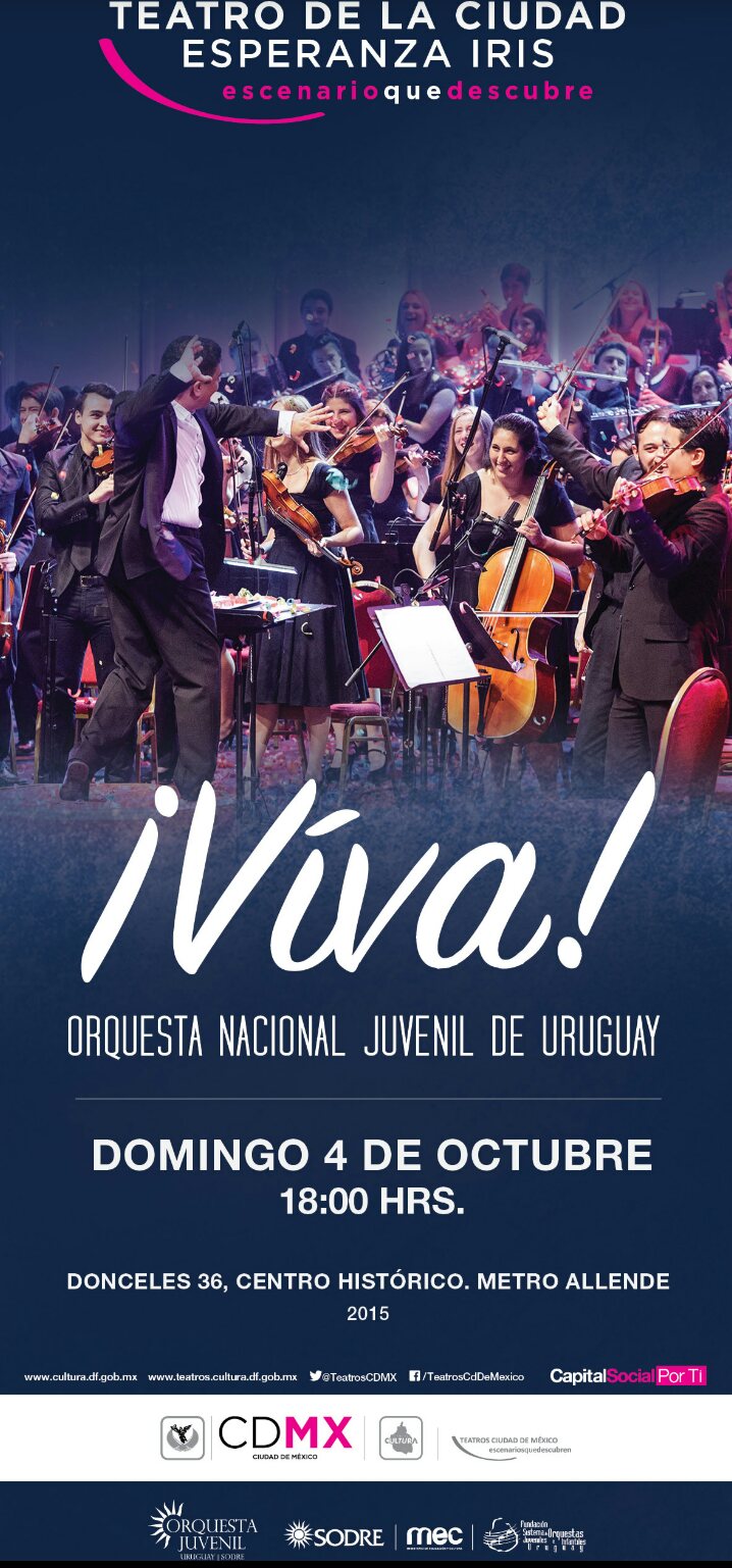 La Orquesta Nacional Juvenil de Uruguay presenta Viva!; un concierto inolvidable es su Gira Internacional EEUU / México 2015. Los ritmos y melodías nos harán viajar por el continente sudamericano, desembarcando inevitablemente en la región del “Río de la Plata”, impregnado de tango y candombe, dos géneros declarados “patrimonio intangible de la humanidad” por la UNESCO.