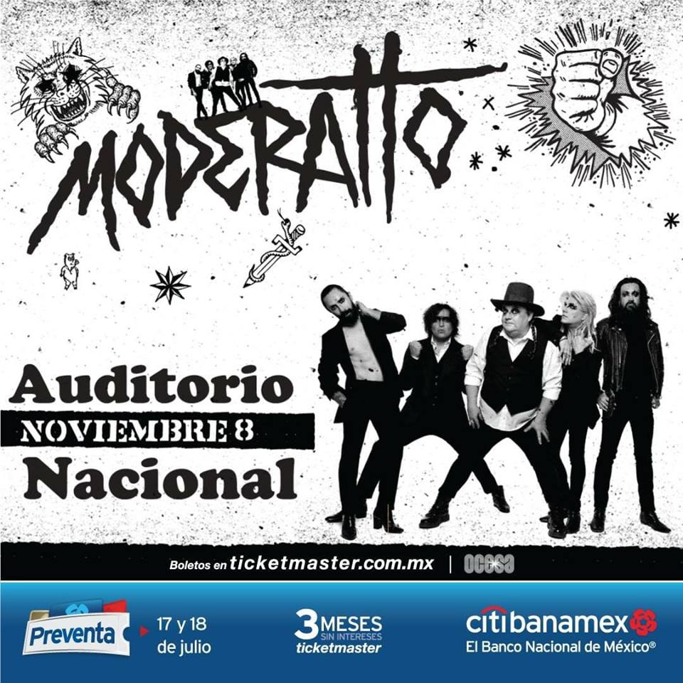 El monstruo de cinco cabezas, conocido como Moderatto, llegará de nueva cuenta con su metralla roquera a las instalaciones del Auditorio Nacional, escenario que los ha cobijado en múltiples ocasiones con gran éxito. La fecha para ver a Bryan, Xavi, Mick, Roy y Elohim será el jueves 8 de noviembre. La preventa Citibanamex se realizará el 17 y 18 de julio. Mientras que la venta al público en general comenzará a partir del 19 de julio en las taquillas del inmueble y a través del sistema Ticketmaster.
