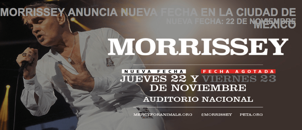 Gracias a la incomparable respuesta de sus fans mexicanos y debido la alta demanda de boletos, Morrissey y OCESA anuncian hoy que se abrirá un segundo concierto en el Auditorio Nacional. Esta nueva fecha está programada para el 22 de noviembre de 2018 y los boletos estarán disponibles en Preventa Citibanamex el miércoles 18 de julio y la Venta General comenzará el 19 de julio a través de http://www.ticketmaster.com.mx y al 53-25-9000 así como en las taquillas del Auditorio.