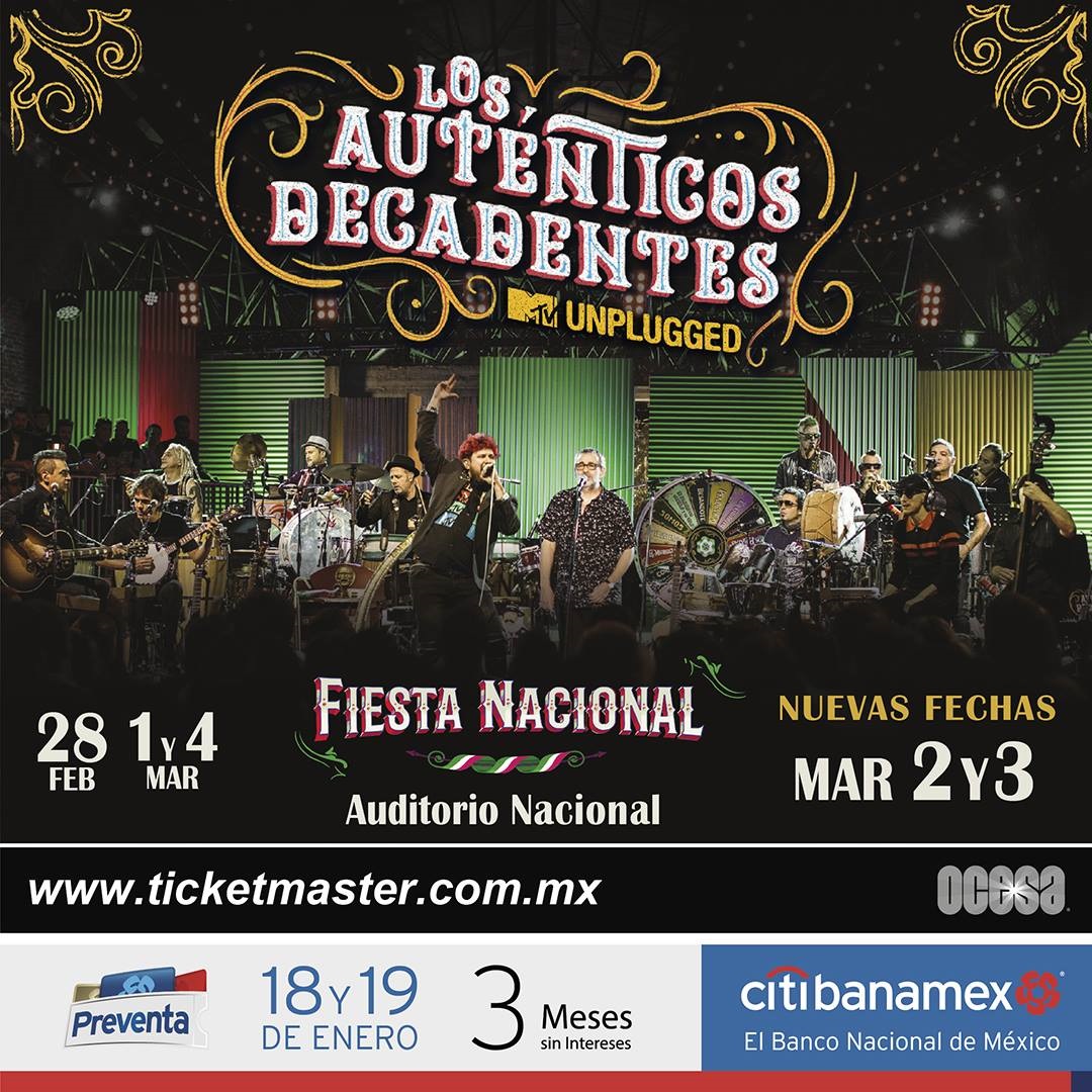 Para beneplácito de sus fieles seguidores aztecas, la mítica banda argentina Los Auténticos Decadentes darán dos conciertos más, 2 y 3 de marzo, aparte de los ya programados, 28 de febrero, 1º y 4 de marzo, de su show Fiesta Nacional, en el Auditorio Nacional. Con ello, serán cinco presentaciones las que ofrecerán en el coloso de Avenida Reforma. La preventa Citibanamex para estos dos nuevos recitales se realizará los días 18 y 19 de enero. Mientras que la venta al público en general comenzará a partir del 20 de enero en las taquillas del inmueble y a través del Sistema Ticketmaster.