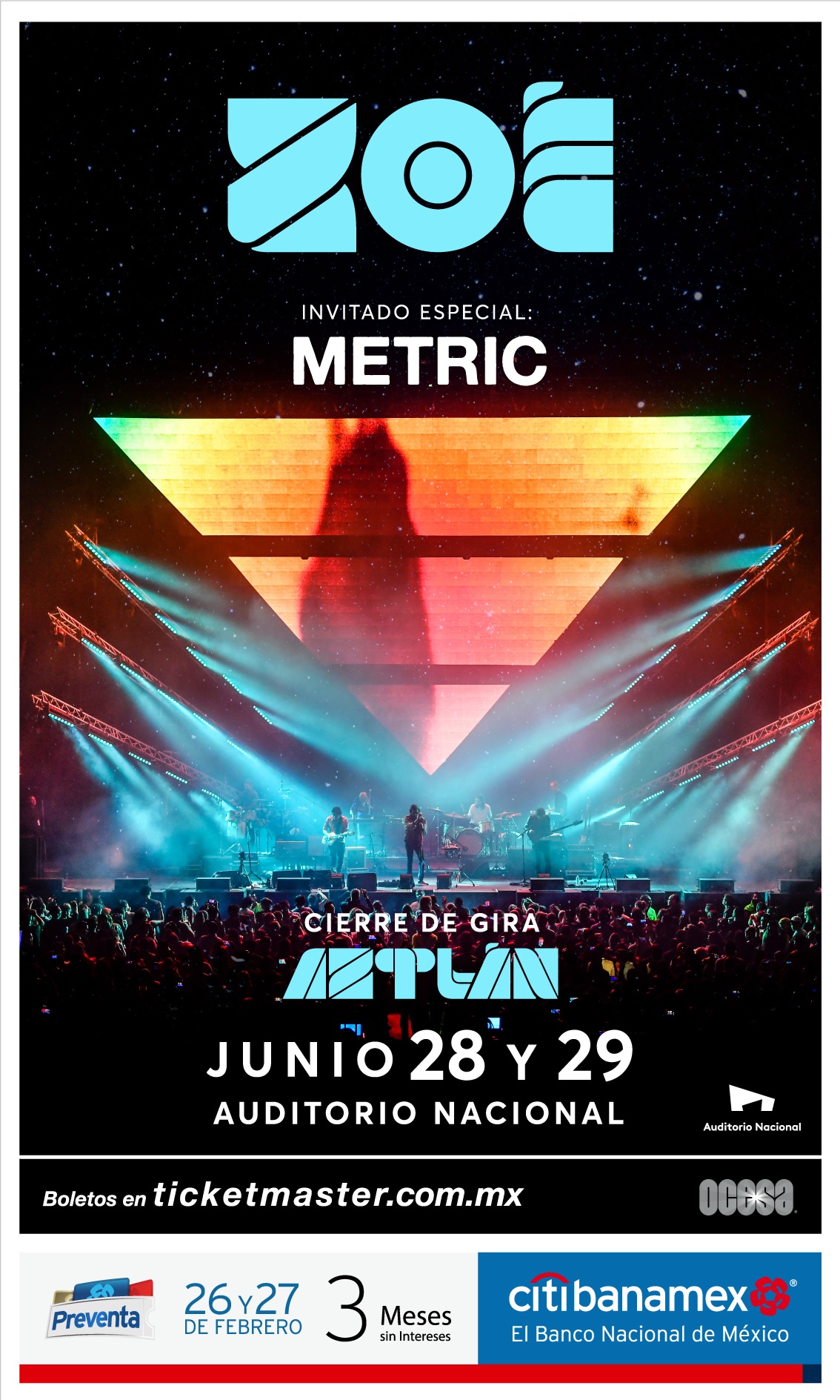 Luego de sus exitosas presentaciones en el Auditorio Nacional y el Palacio de los Deportes, donde colgaron el letrero de localidades agotadas, Zoé, la banda más importante de la actualidad del rock mexicano, llegará de nueva cuenta a los escenarios de la capital para dar el cerrojazo final a su Gira Aztlán. Y para poner la cereza en el pastel, traerán a sus colegas canadienses de Metric, con los que estarán girando en sus presentaciones por los Estados Unidos. Sin duda, el Auditorio Nacional se cimbrará con el potente rock de ambas agrupaciones el próximo 28 y 29 de junio. La preventa Citibanamex se realizará los días 26 y 27 de febrero. La venta al público en general comenzará a partir del 28 de febrero en las taquillas del inmueble y a través del Sistema Ticketmaster.