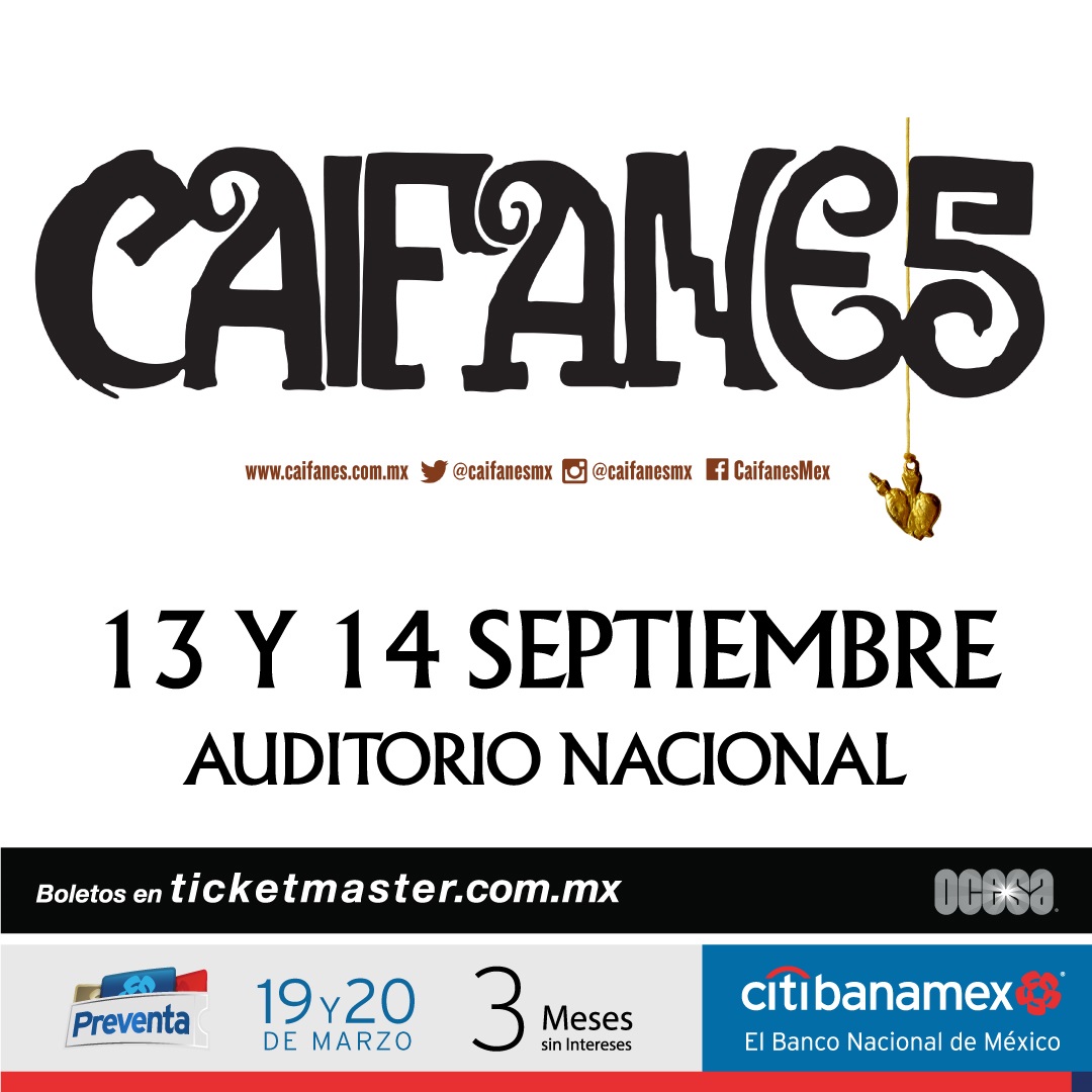 Luego de ofrecer un apoteósico show con un lleno total de más de 90 mil seguidores en la vigésima edición del festival Vive Latino, Caifanes anuncia su retorno a los escenarios de la CDMX. Es así que su fiel público los verá en vivo los próximos 13 y 14 de septiembre en el Auditorio Nacional. La preventa Citibanamex se realizará los días 19 y 20 de marzo. Mientras que la venta al público en general comenzará el 21 de marzo en las taquillas del inmueble y a través del Sistema Ticketmaster.