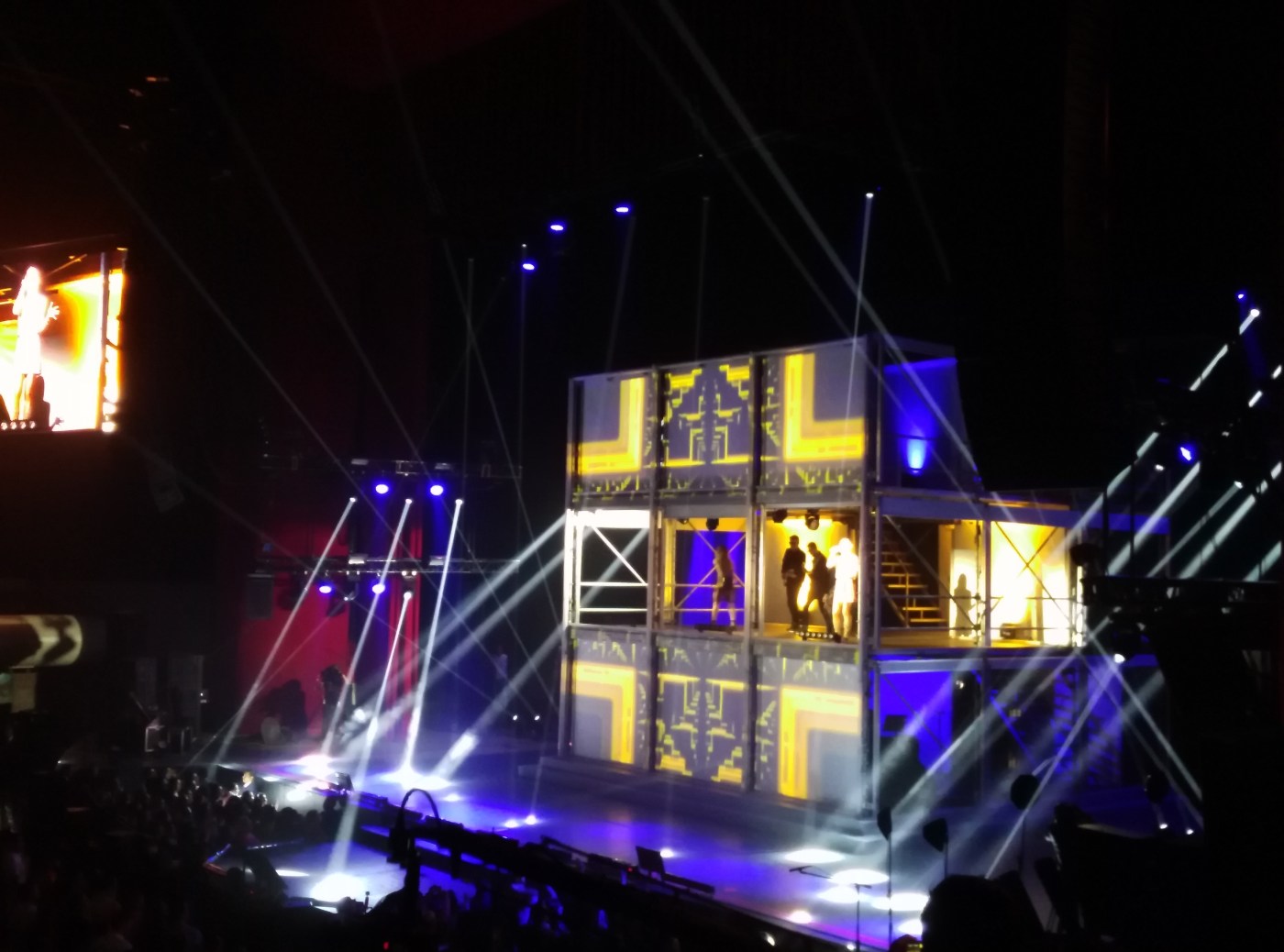 El Auditorio Nacional estaba listo para recibir a Sasha Benny y Erick con su «Vuelta al Sol». En el centro del escenario un cubo compuesto de tres pisos y por el frente dividido en nueve pantallas movibles en las que se proyectaban diferentes visuales y por las cuales salían, entraban y aparecían los músicos y cantantes.