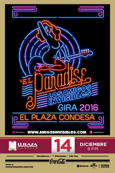 Los Amigos Invisibles es sin lugar a dudas una de las bandas venezolanas más queridas en la escena musical latina en la actualidad y con mayor proyección internacional. Este 2016 Julio Briceño (voz), Mauricio Arcas (percusiones), Juan Manuel Roura (batería) y José Rafael Torres (bajo), están de regreso en los escenarios con la gira “El Paradise Tour 2016”, con la cual regresan al escenario de El Plaza Condesa para ofrecer un exclusivo concierto el próximo 14 de Diciembre. Los boletos para esta única presentación en la Ciudad de México estarán a la venta a partir de este Jueves 6 de Octubre en taquillas y la red Ticketmaster en http://www.ticketmaster.com.mx y al teléfono 53-25-9000.