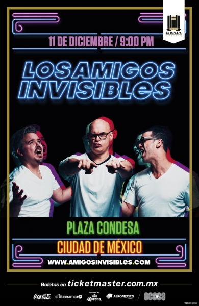 La agrupación venezolana, Los Amigos Invisibles, refrenda su amor por el público mexicano y anuncia una fecha en la Ciudad de México en próximo 15 de Diciembre en El Plaza Condesa. Los boletos estarán disponibles en venta general a partir del Viernes 29 de Septiembre a las 12 hrs. en taquillas del inmueble y la red Ticketmaster en http://www.ticketmaster.com.mx y al teléfono 53-25-9000.
